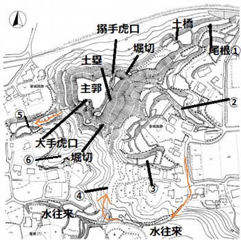 大手虎口--尾根道から続く道を登りきると山の頂上の主郭に入るための大手虎口に至る。大手虎口は、崖や土塁で囲まれている主郭に入るための僅かな狭い道である。平時の出入り口であるが、敵の侵攻口として狙われた時のため櫓、横矢掛等の厳重な構がなされていたと思われるが、僅かに地形にその名残を残すだけとなっている。この反対の北側には搦手虎口(退却口)が設けられ土橋方面の尾根道を下るようになっている。