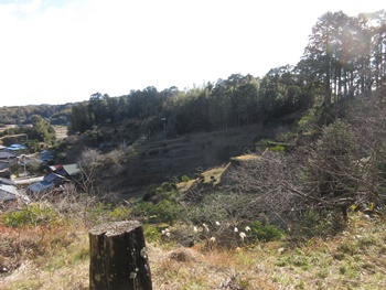 府中方面--主郭の北側面は崖が切り立っている。この方面には土塁はない。崖は築城に当たり切り崩され攻めを難くしたものと思われる。安房の国の国府は府中にあったが、この方面には広く豊かな平野を望むことができた。